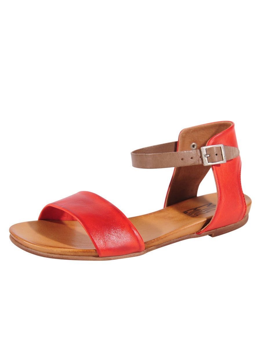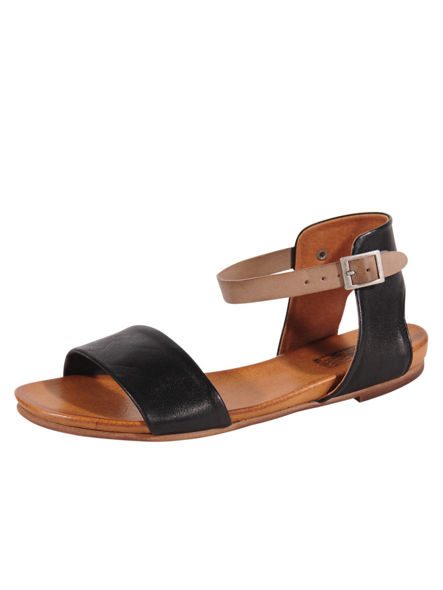 A two-piece pebbled leather sandal with contrasting ankle strap that features a buckle closure and cushioned footbed.